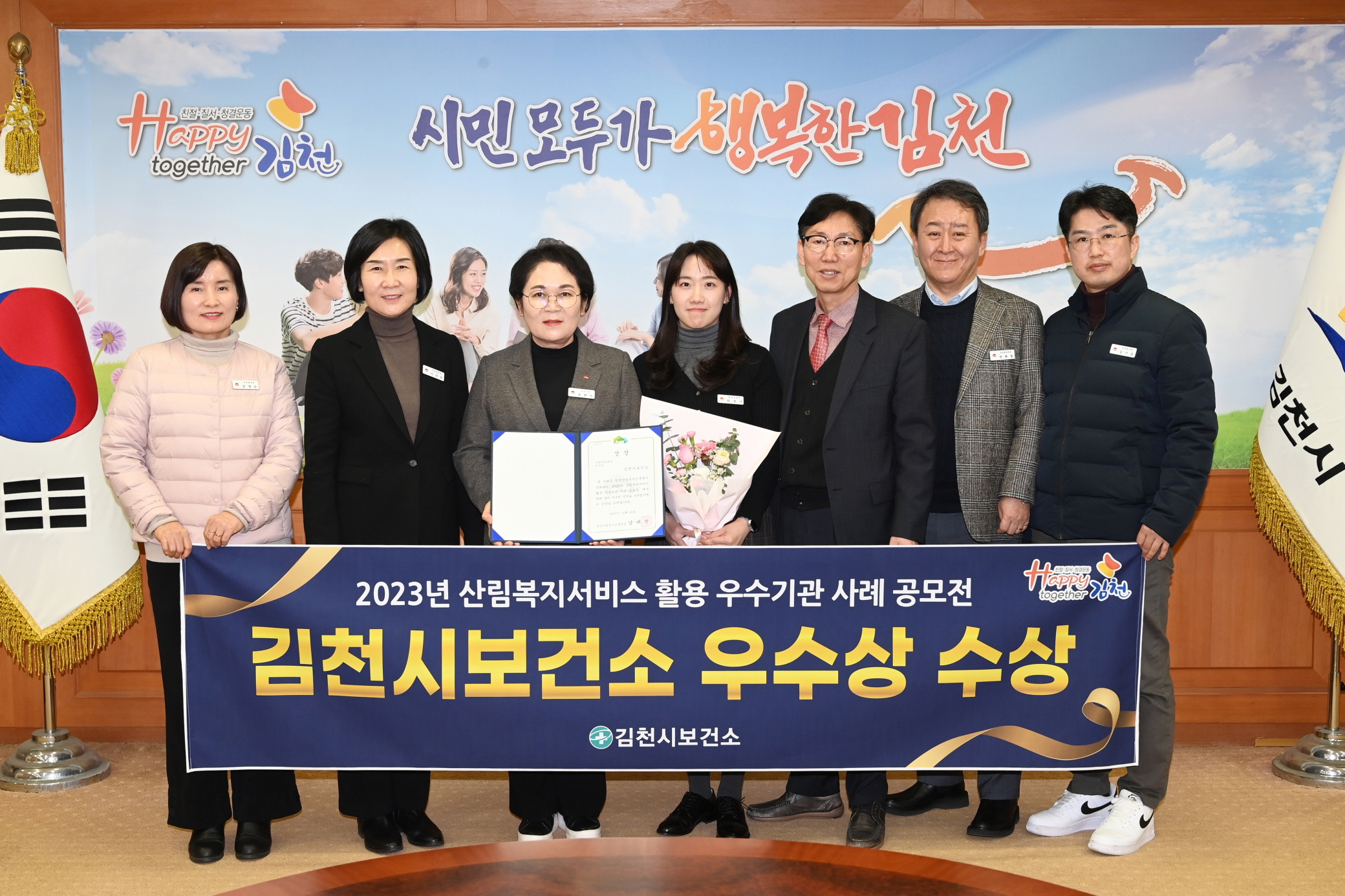 | 김천시 보건소는 12월 22일 대전 한국산림복지진흥원 대회의실에서 열린 ‘2023년 산림복지서비스 활용 우수기관 사례 공모전’에서 우수상을 받았다.