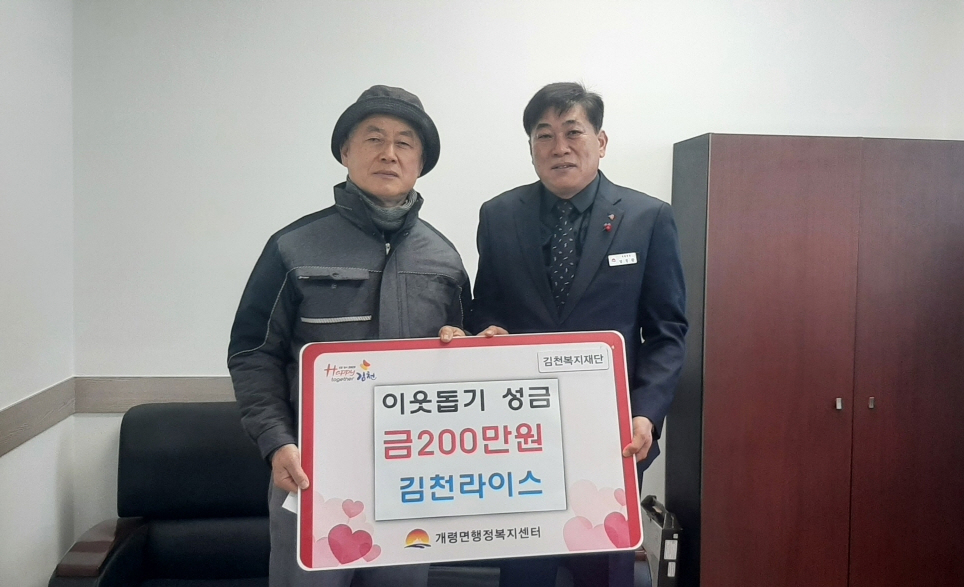 | 김천시 개령면에 있는 김천 라이스(대표 임덕순)가 연말을 맞아 이웃돕기 성금 200만 원을 기탁했다.