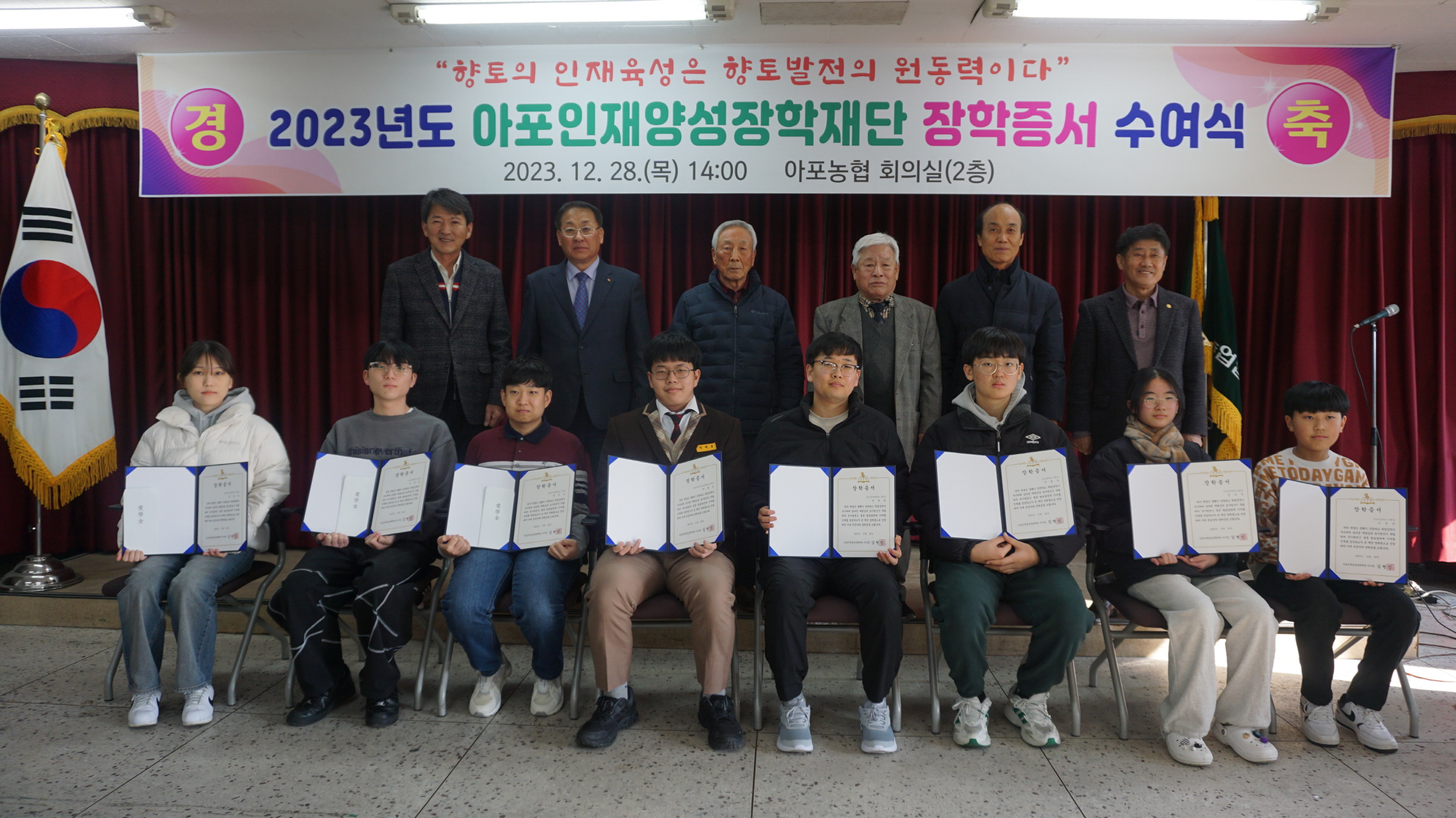 | 아포인재양성장학재단(이사장 김현인)은 지난 12월 28일 아포농협 회의실에서 아포인재양성재단 강타관 이사, 아포농협 성기호 조합장 등이 참석한 가운데 2023년 장학증서 수여식을 가졌다.