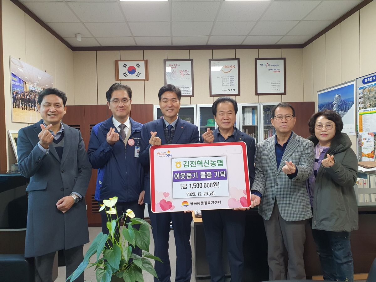 김종현 율곡동장은 “지역사회를 위해 발 벗고 나서서 도움을 주신 김천혁신농협 이성희 조합장님, 김준식 상임이사님, 혁신하나로마트 여오기 지점장님께 감사드리며, 어려운 이웃들을 위해 묵묵히 나눔과 봉사에 지속적으로 참여해 주시는 화개장터 김성득 대표님께도 감사드린다”며 감사의 마음을 전했다.