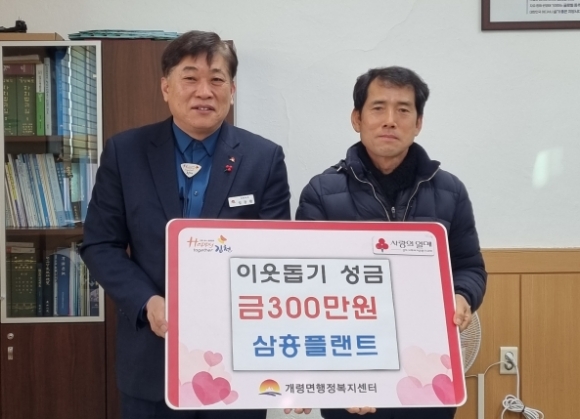 | 갑진년 새해에도‘희망 2024년 나눔 캠페인’실천을 위해 ㈜삼흥플랜트(대표 이승화)는 1월 11일 개령면 행정복지센터에 성금 300만 원을 전달했다.