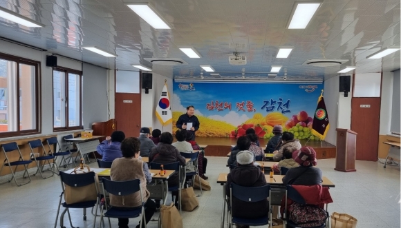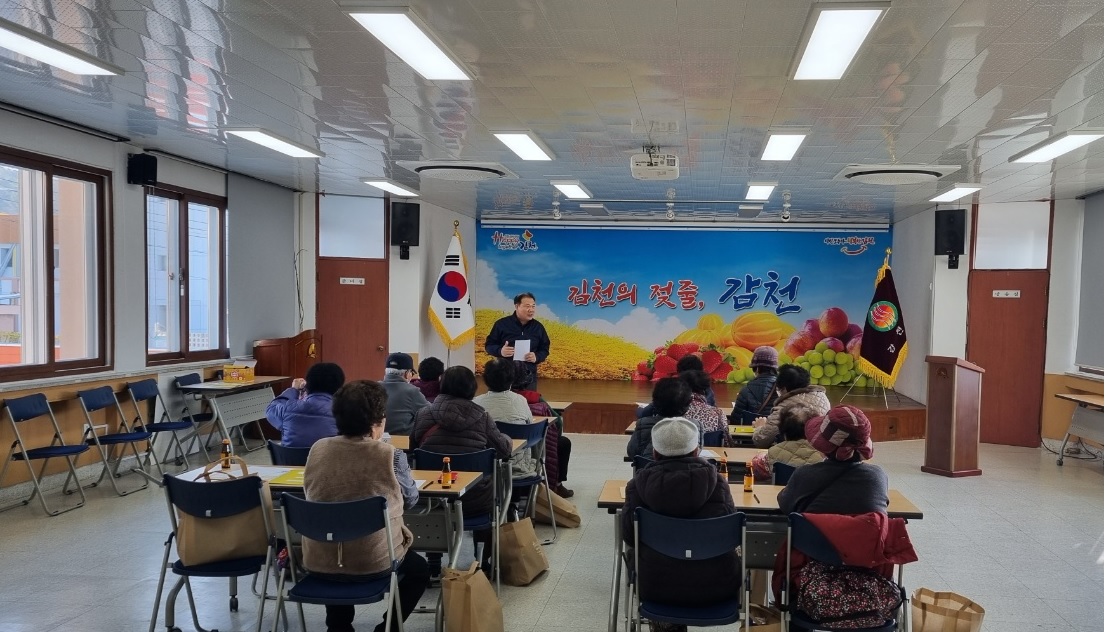 | 감천면행정복지 센터는 1월 12일 노인 일자리 사업 참여자 18명이 참석한 가운데 『2024년 노인 일자리 사업 안전교육』을 실시했다. 안전교육은 출퇴근길 교통안전 교육, 근로활동 중 사고 발생 대처 방법 순으로 진행되었다.