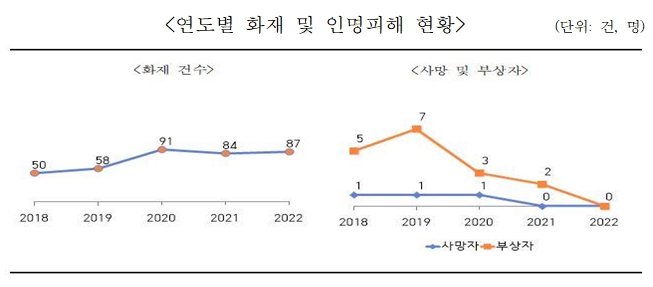 최근 5년(2018 ~ 2022)동안 김천지역 겨울철(12.1~다음해 2.28) 화재발생은 연평균 74건이며, 이 기간 동안 3명이 사망하고 17명이 화상 및 유독가스 흡입 등으로 부상을 입었다.