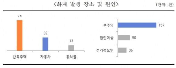 소방청 국가화재정보시스템 통계에 따르면 관내 화재 발생 장소로는 단독주택이 가장 많았고, 그 다음으로 자동차, 동식물 순으로 화재가 발생했다.