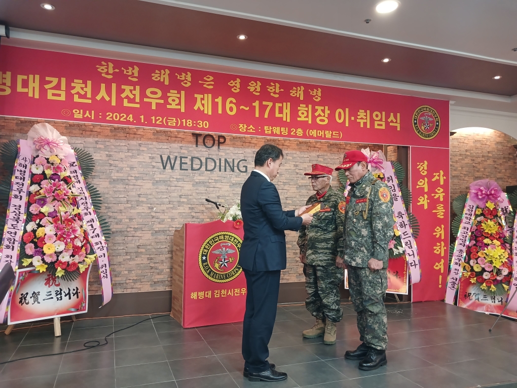 강연진 김천시 건설안전국장은 “그동안 고생하신 이병재 전임 회장님께 감사의 인사를 전하고 앞으로도 해병대 김천시 전우회가 김천시를 위한 헌신적인 봉사활동으로 해병대의 명예를 높이고, 어두운 곳을 밝히는 사회의 등불이 되길 바란다”라고 전했다.