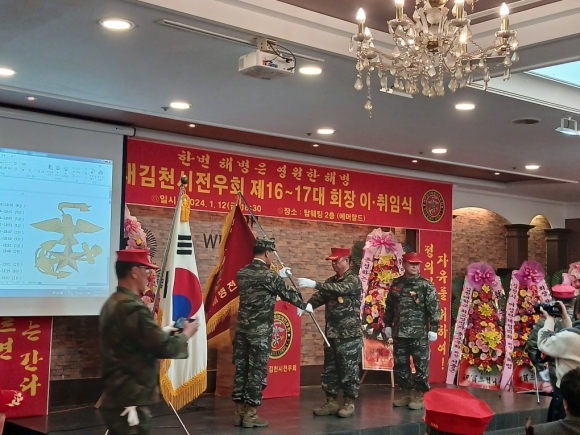 | 해병대 김천시전우회는 지난 1월 12일 탑웨딩에서 제16, 17대 회장 이‧취임식과 해병의 밤 행사를 개최했다.