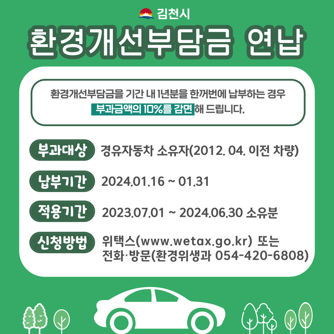| 김천시는 환경개선부담금 부과 대상 경유 자동차를 소유한 자를 대상으로 2024년 1월 16일부터 31일까지 환경개선부담금 일시 납부(연납) 신청받는다.