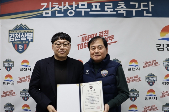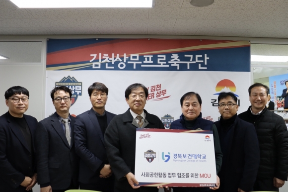 | 김천상무프로축구단(대표이사 배낙호)이 1월 22일, 대표이사실에서 경북보건대학교와 양해각서(MOU)를 체결했다. 이날 MOU에는 경북보건대학교 이은직 총장과 채승용 기획처장, 배대성 학사운영처장, 박성대 총무팀장, 스마트물류과 김시영 교수, 산업협력처 이상민 팀장과 김천상무 배낙호 대표이사가 참석했다.