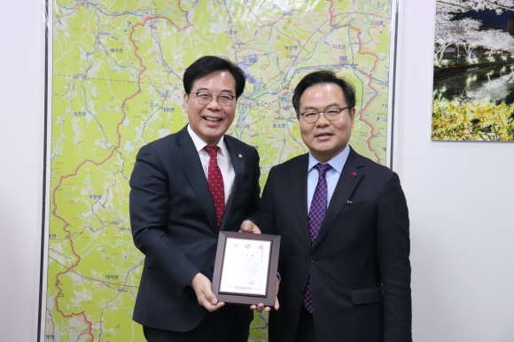 | 송언석 국회의원 ( 경북 김천 , 재선 ) 이 1 월 26 일 , 이철우 경상북도지사로부터 경상북도 발전의 마중물이 될 국비 확보에 기여한 공로를 인정받아 감사패를 수여받았다 .