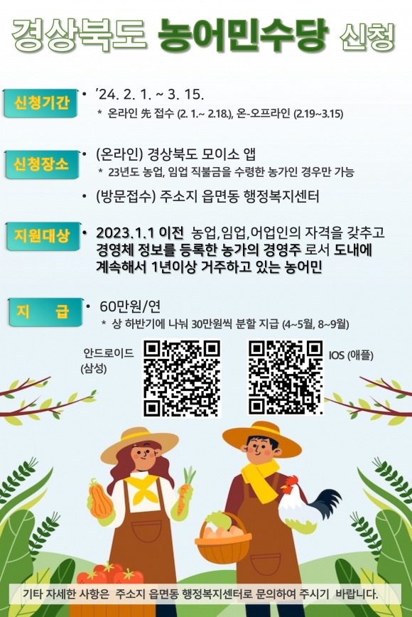 | 경상북도는 2월 1일부터 3월 15일까지 도내 농어업인을 대상으로 2024년 농어민수당을 신청받는다.