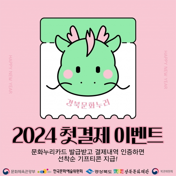 경상북도 카드발급자를 대상으로 하는 ‘첫 결제 이벤트’는 2월 1일부터 2월 29일까지 시행되며, 2024년 첫 사용내역을 경북 문화누리 채널 추가 후 카카오톡 1:1 채팅으로, 또는 경북문화재단 누리집(홈페이지) 내 신청서를 작성하고 증빙서류를 우편으로 제출하면 기프티콘을 제공한다.