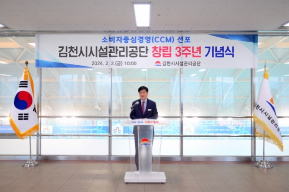 |  | | | ⓒ 김천내일신문 | | 김천시 시설관리공단(이사장 김재광)은 지난 2월2일 김천실내수영장에서 창립 3주년 기념식 개최와 함께 소비자중심경영을 선포했다.