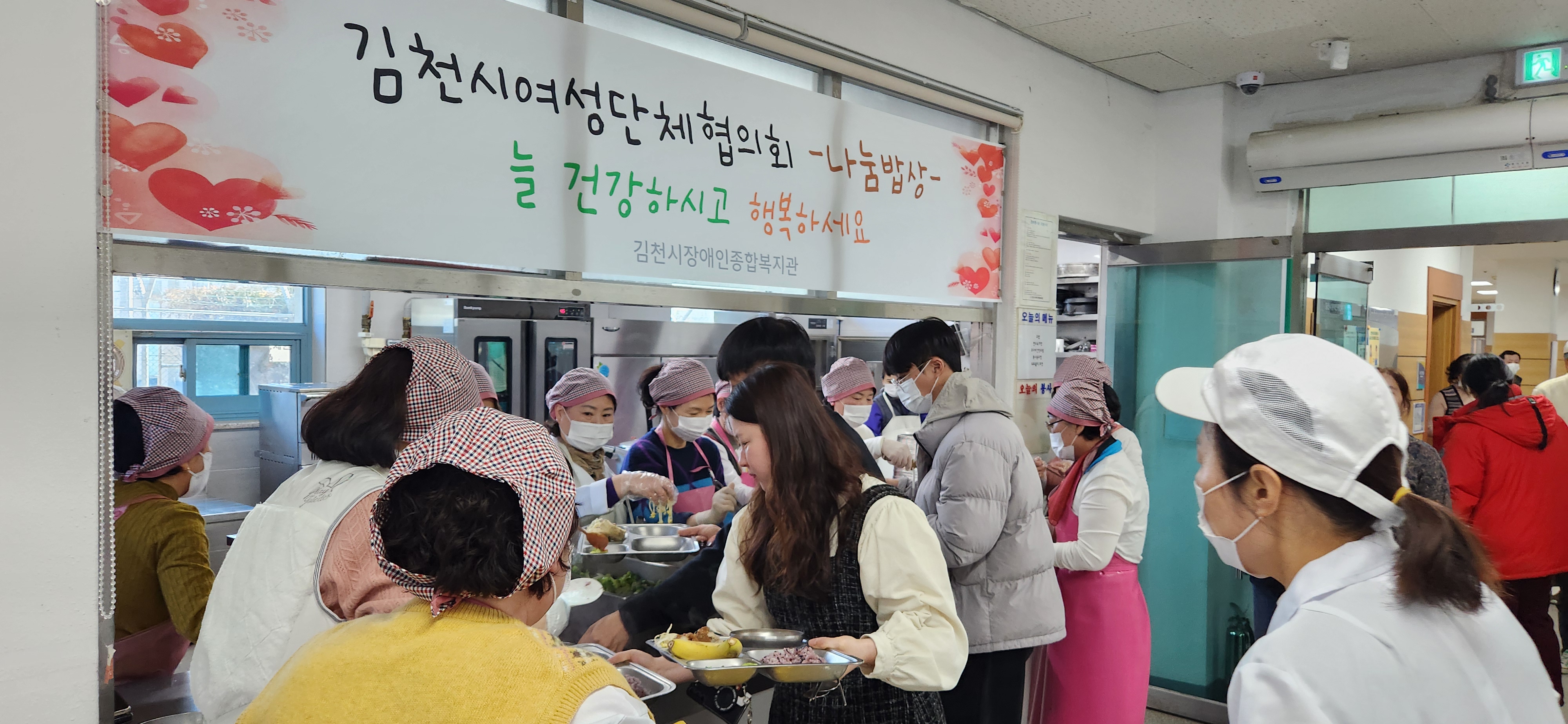 | 김천시여성단체협의회(회장 김혜영)는 2월 13일 김천시종합장애인복지관에서 ‘나눔 밥상’봉사활동을 펼쳤다. 이날 김혜영 회장을 비롯한 12명의 회원들은 ‘나눔 밥상’ 봉사를 위해 후원금 100만 원을 기부하고, 직접 음식을 만들어 장애인종합복지관 이용자 모두에게 정성이 담긴 음식을 대접했으며 몸이 불편한 장애인들을 위해 식사 도우미의 역할도 했다.