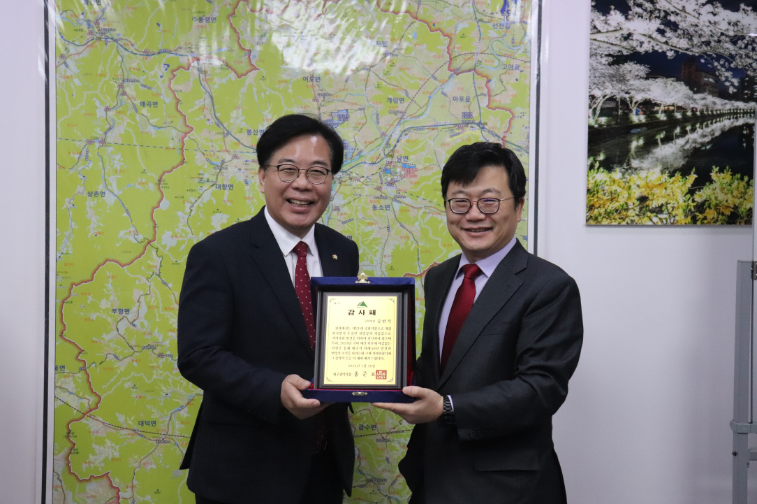 이에, 홍준표 대구시장은 송언석이 제21대 국회의원으로 재임하며 투철한 사명감과 책임감으로 대구·경북 발전을 위해 헌신했을 뿐 아니라, 올해 대구시 국비 예산 확보에 기여한 공로를 인정하여 감사패를 전달했다. 한편, 이철우 경북지사 또한 지난 1월 26일 경북지역 국비 확보에 기여한 송언석 김천시 국회의원의 공로를 인정하여 감사패를 전달한 바 있다.