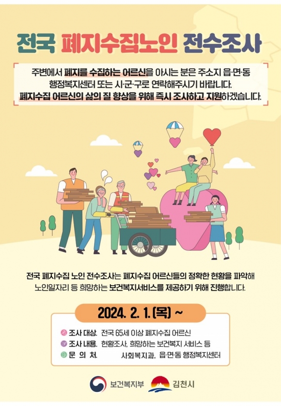 | 김천시는 오는 3월 말까지 폐지 수집으로 생계를 이어가는 노인 전수조사를 진행한다고 밝혔다.