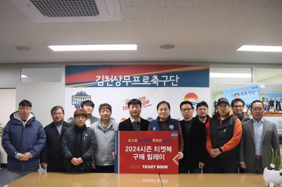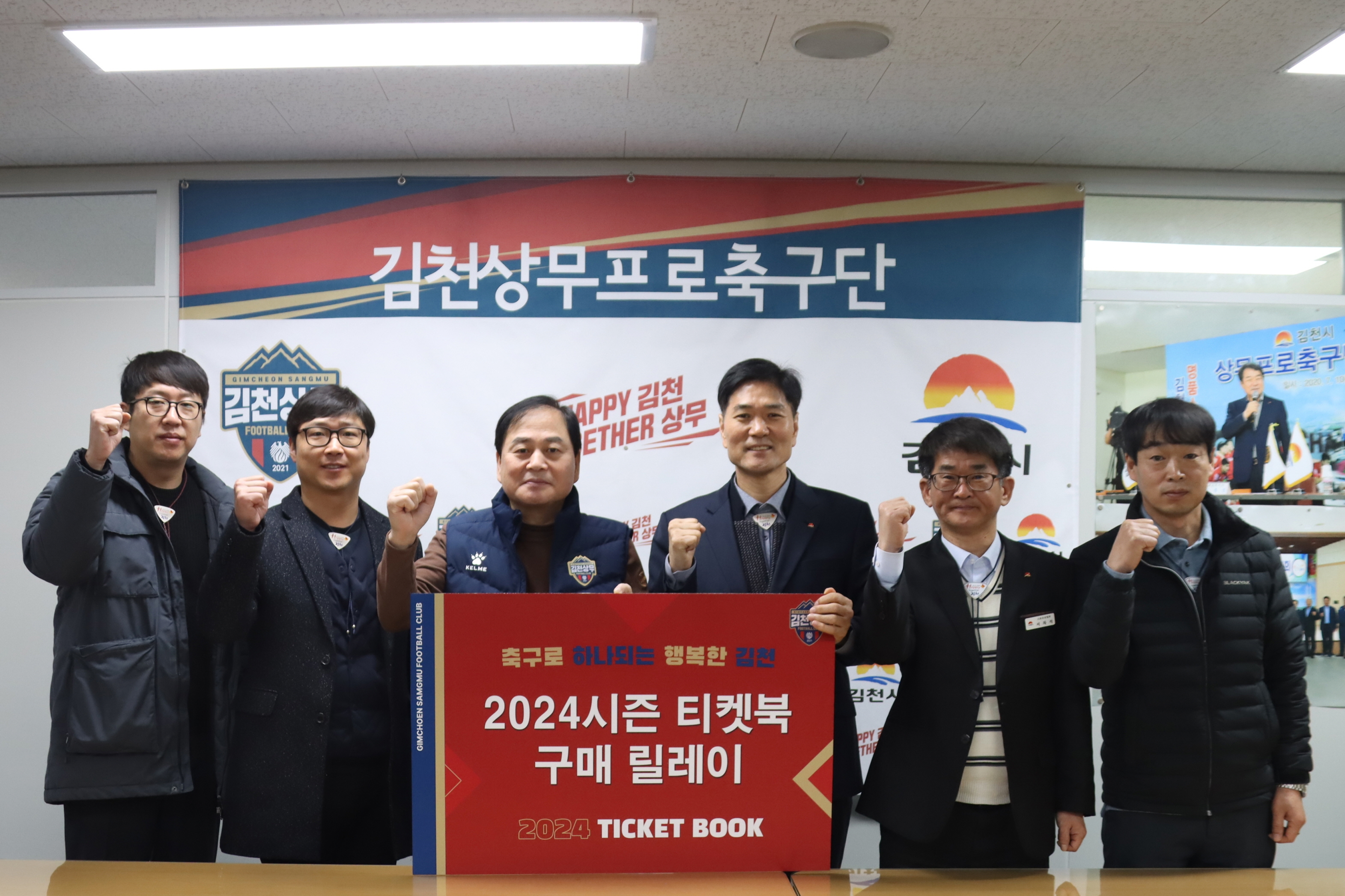 김천상무프로축구단(대표이사 배낙호)이 2월 23일, 김천시스포츠산업과(이하 스포츠산업과)와 김천시축구협회 티켓북 릴레이 구매 행사를 진행했다. 김천상무 홈경기 흥행을 위해 스포츠산업과와 김천시축구협회는 올해도 구매 릴레이를 이어간다.
