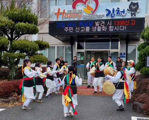 추운 날씨에도 불구하고 농악단원들은 우리나라 고유의 민속놀이인 지신밟기를 통해 올해 감천면 주민들의 오랜 소망과 행복이 성취되길 염원하며 행사를 진행했다.