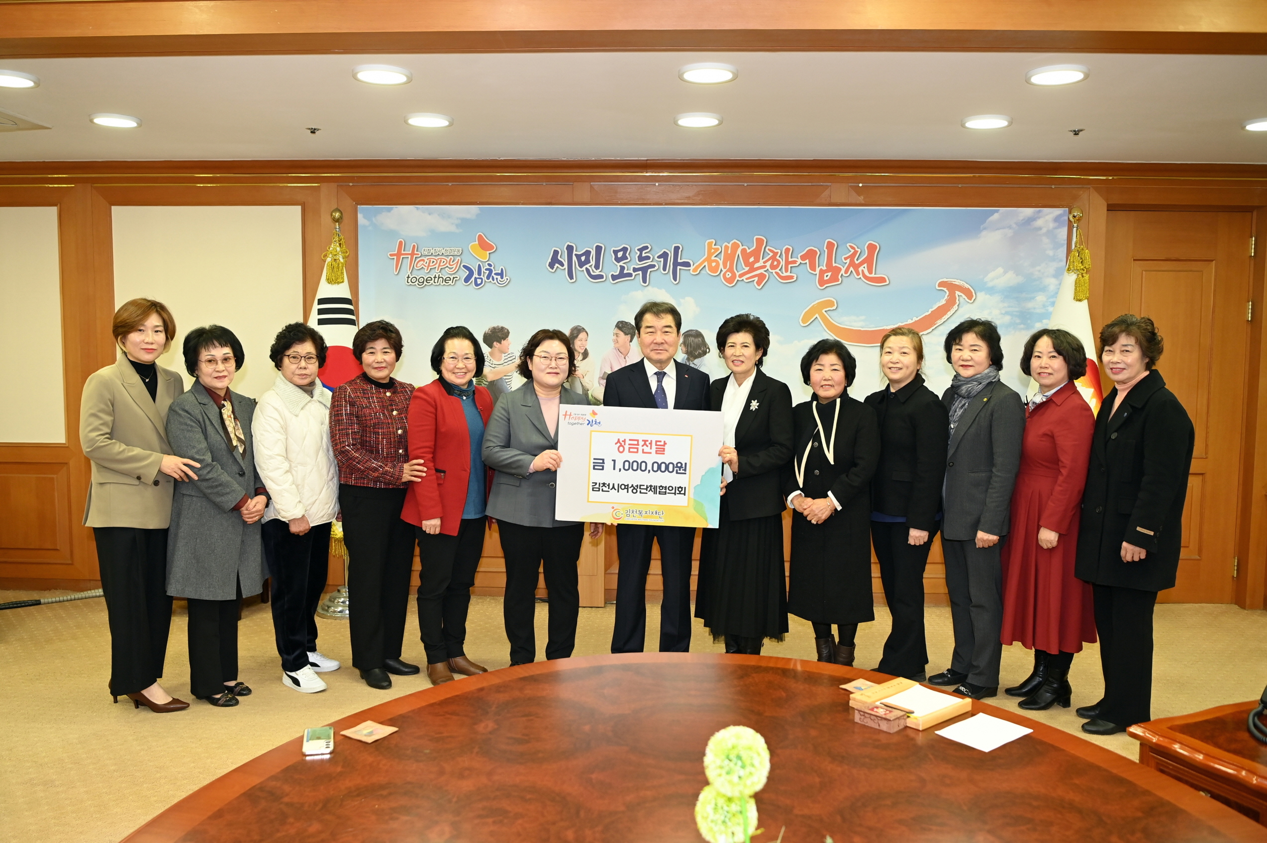 | 김천시여성단체협의회(회장 김혜영)는 2월 28일 김천시청을 방문해 소외되고 어려운 이웃을 위해 써 달라며 김천복지재단에 성금 100만 원을 전달했다. 김혜영 회장은 “올해도 회원들의 마을을 모아 나눔 기부에 동참하게 되어 뜻깊다. 우리의 작은 나눔이 어려움을 겪고 있는 이웃에게 조금이나마 보탬이 되었으면 한다. 앞으로도 지역사회를 살피고 어려움을 겪는 우리 지역의 소외된 이웃을 위해 꾸준히 나눔을 실천하고 싶다"라고 말했다.