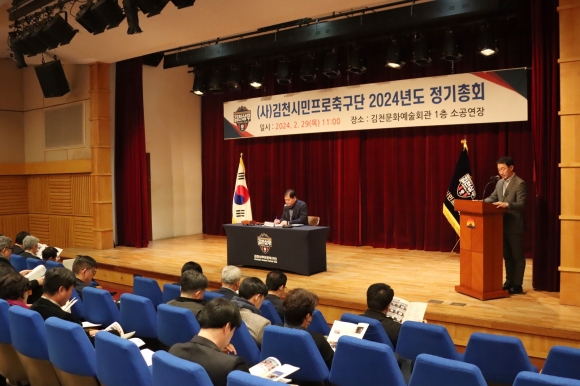 | 김천상무프로축구단(대표이사 배낙호)이 2월 29일, 김천시 문화예술회관에서 2024년도 정기총회를 개최했다. 김천상무는 이번 정기총회를 통해 2023년도 사업 결산 및 신규가입 대의원에 대한 승인 등을 논의했다.