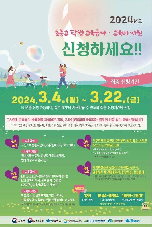 | 경북교육청(교육감 임종식)은 저소득층 학생의 교육 기회 보장과 가구의 교육비 부담 경감을 위해, ‘교육급여’와 ‘교육비’ 지원 집중 신청 기간을 3월 4일부터 22일까지 운영한다.