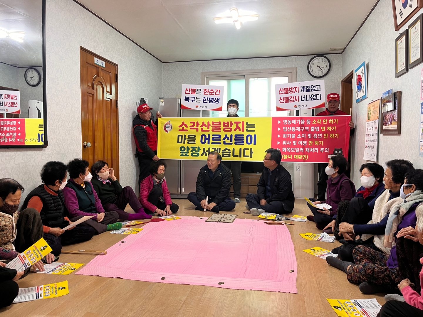 이번 산불방지 활동은 산림 인접 경작자와 어르신들의 불씨 취급 부주의로 인한 산불 사전 차단을 위해 관내 경로당을 방문하여 산림 보호의 중요성을 설명했으며, 산불 예방 지역주민 행동 요령, 산불 관련 과태료부과 기준 등 안내문(산불 예방을 위해 나부터 실천하고 이웃에게 알려주세요!)을 자체 제작하여 산림 인접 경작자, 화목보일러 사용자, 외딴집 등에 배부했다.