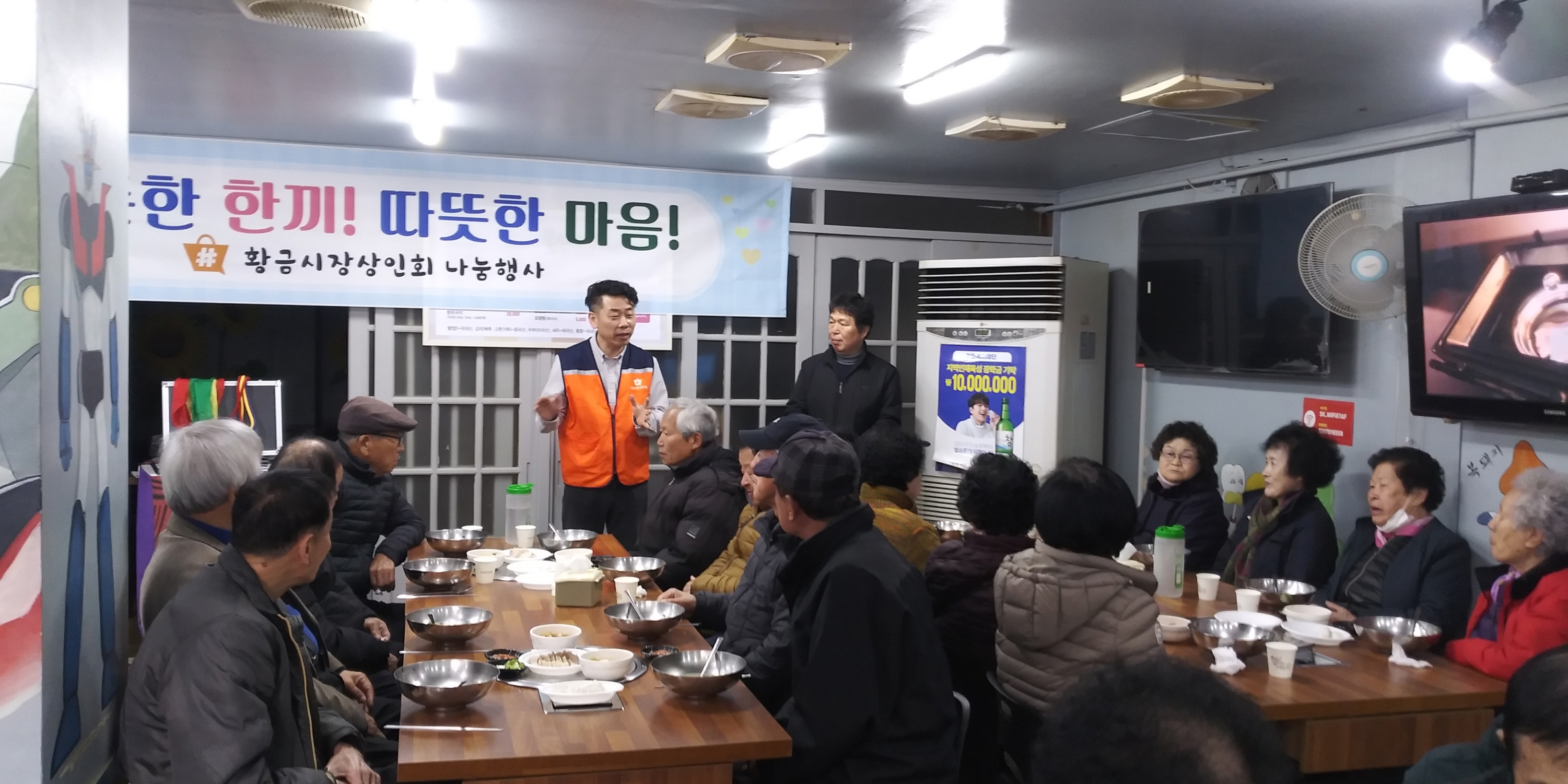 | 김천시 황금시장상인회는 지역 어르신들을 위한 ‘든든한 한 끼! 따뜻한 마음!’ 행사를 추진했다. 2월 29일 박선광 황금시장상인회장이 운영하는 복돼지 숯불식육식당에서 강변경로당 회원 49명을 초대해 떡국, 수육 등 맛난 점심 음식를 대접했다.