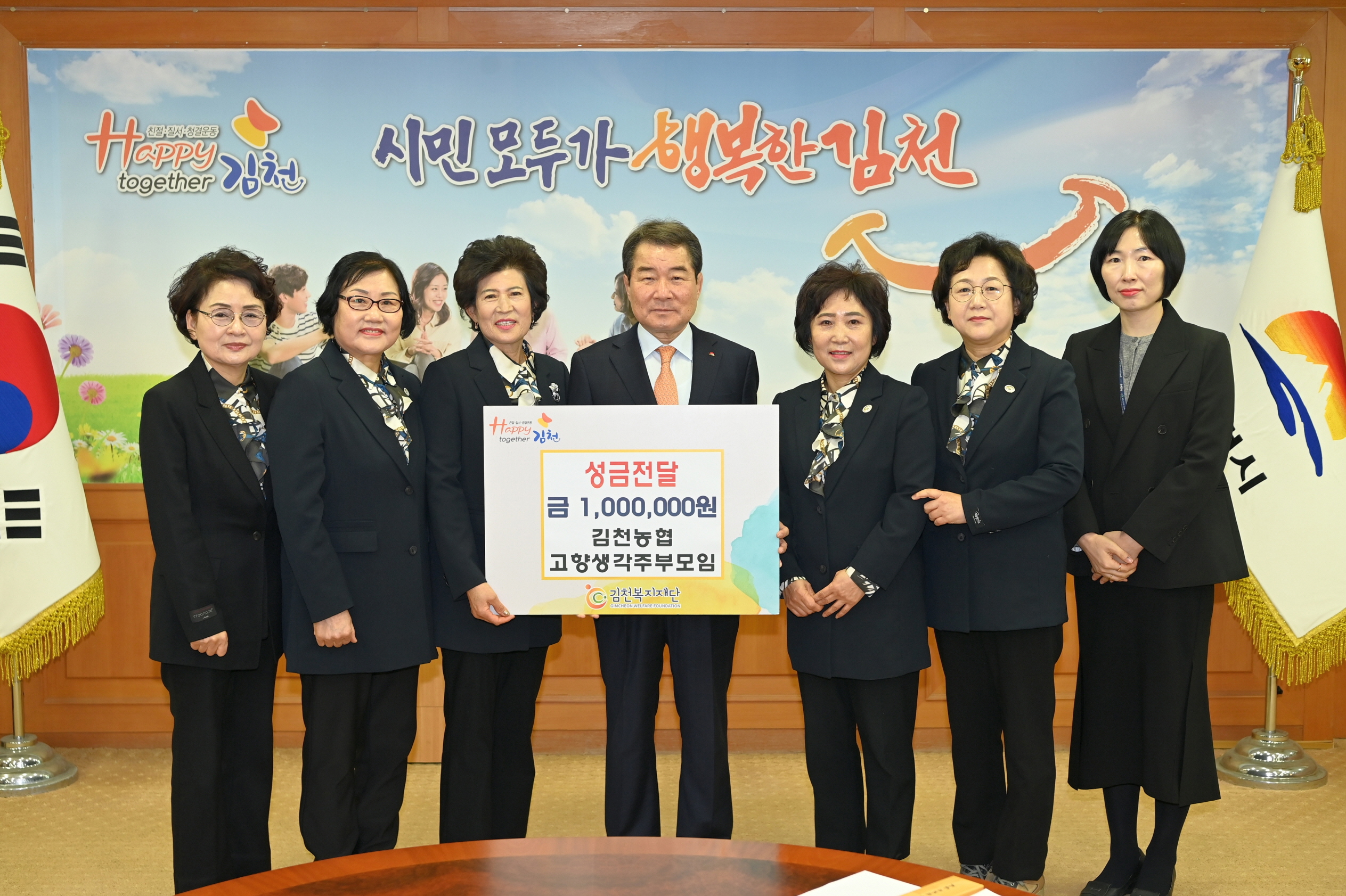 | 김천복지재단(이사장 김충섭)은 3월 4일 김천농협 고향생각주부모임(회장 현숙희)으로부터 성금 100만 원을 전달받았다고 밝혔다. 고향생각주부모임은 농업‧농촌 발전에 중심이 되는 여성단체로, 김천농협과 연계해 여성 복지 향상과 지역사회 균형 발전을 위해 다양한 활동을 펼치고 있으며, 매년 이웃돕기 성금을 전달하는 등 나눔문화 확산에 적극 앞장서고 있다.
