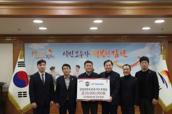 | 김천상무프로축구단(대표이사 배낙호)이 3월 4일 오후, 김천시청에서 동희산업의 후원금 전달식을 진행했다. 행사에는 김천상무 김충섭 구단주가 자리한 가운데, 동희산업 박주은 대표, 박치완 상무, 김영진 팀장과 김천상무 배낙호 대표이사, 최한동 후원회장, 이재하 단장이 참석했다.