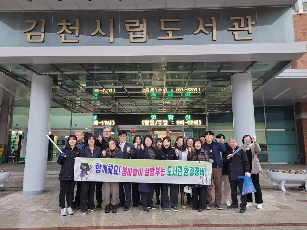 | 김천시립도서관 운영위원회(위원장 김상섭)는 올해 봄을 맞아 3월 5일 시립도서관 직원 일동 및 자원봉사자 10여 명과 함께 도서관을 더욱 아름답게 정비하는 새봄맞이 도서관 환경정화 캠페인을 펼쳤다.