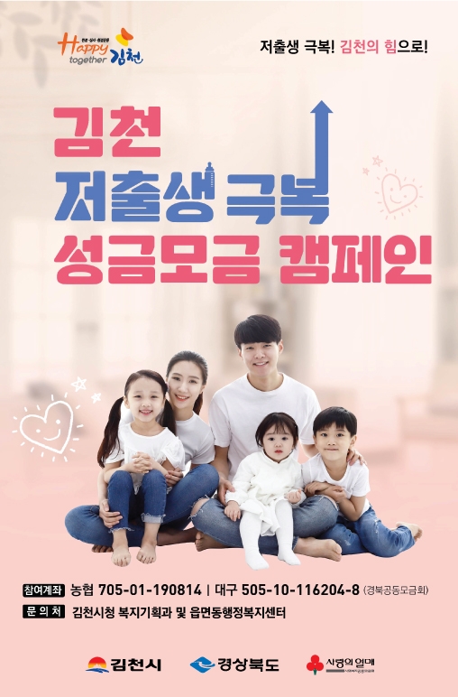 | 김천시(시장 김충섭)는 저출생 극복을 위한 다양한 정책 발굴과 지원을 위해 행정력을 집중하고 있는 가운데 범시민 동참 분위기 조성을 위해 경북사회복지공동모금회와 함께 「저출생 극복 성금 모금 캠페인」을 전개한다.