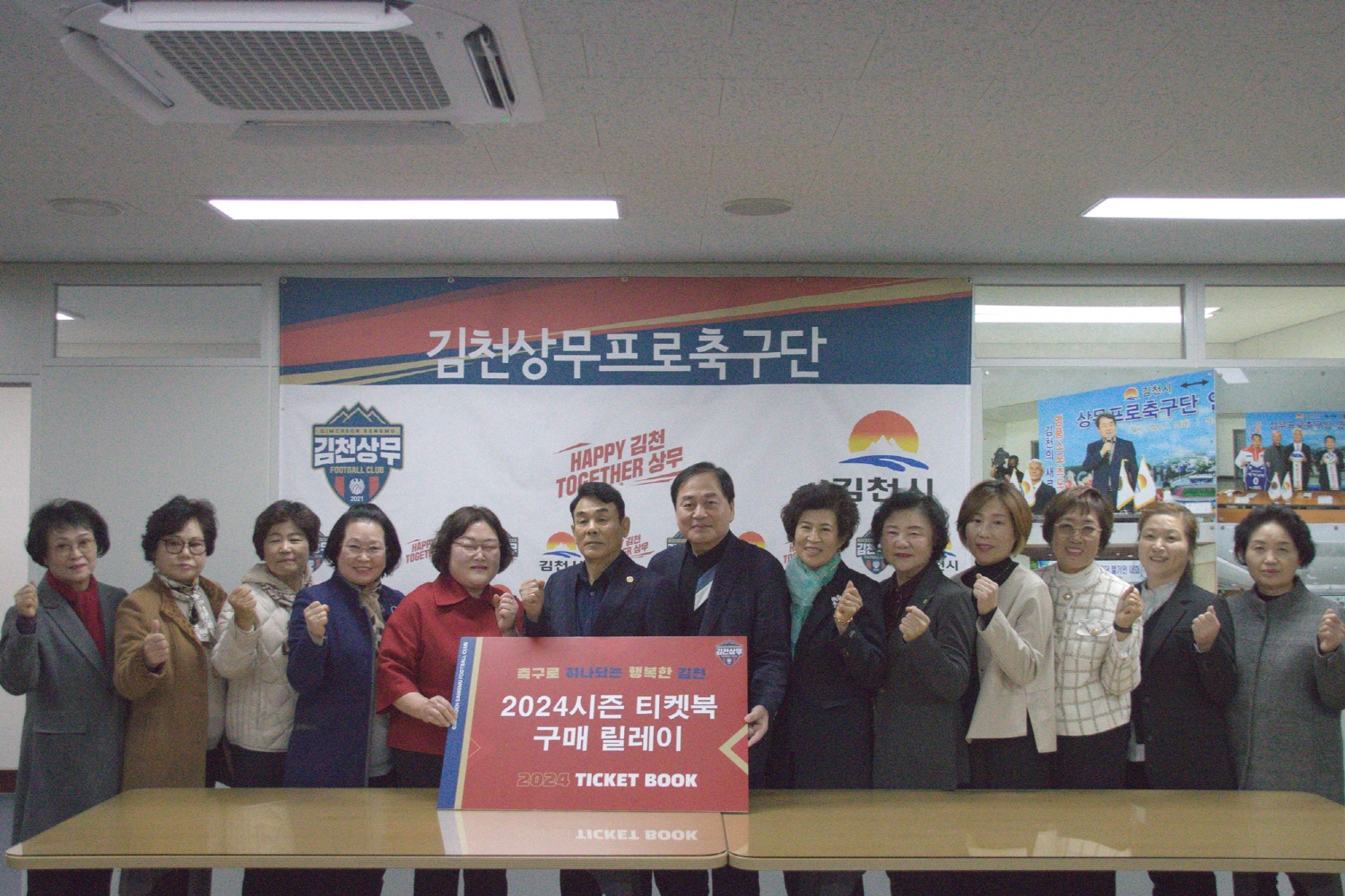| 김천상무프로축구단(대표이사 배낙호)이 대표이사실에서 김천시 여성단체협의회 티켓북 구매 릴레이 행사를 진행했다. 김혜영 회장을 비롯한 협의회 회원과 김천상무 배낙호 대표, 최한동 후원회장이 참석했다.