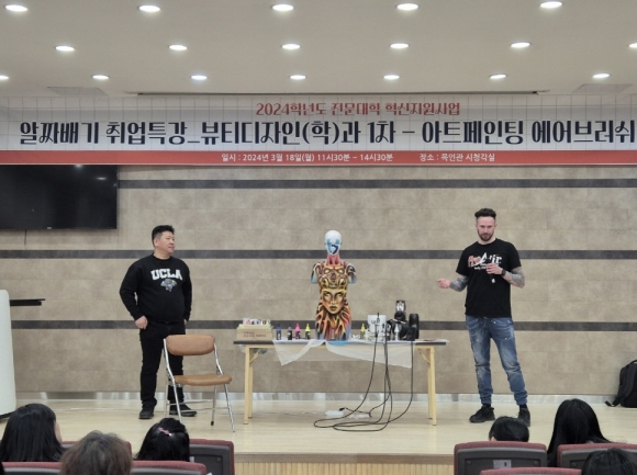이번「알짜배기 취업특강」프로그램에는 월드바디페인팅협회 박찬희 대표와 유리 팔제티(Yuri Falzetti) 2023년 오스트리아 세계바디페인팅 챔피언 아티스트가 강사로 참여를 하였고, 재학생의 실무역량 강화 및 현장실무교육 강화를 목적으로 아트페인팅과 아트 페인팅 특징에 대한 이해 및 미용인의 자세와 마음가짐에 대한 내적 역량 강화를 통해 취업 준비 역량 향상을 위해 지난 3월 18일 목인관 시청각실에서 진행되었다.