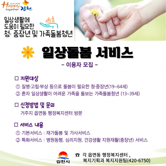 | 김천시(시장 김충섭)는 돌봄이 필요한 청・중장년과 가족 돌봄 청년의 일상생활의 어려움을 해소하기 위해 오는 4월부터 일상 돌봄 서비스 사업을 시행한다고 밝혔다.