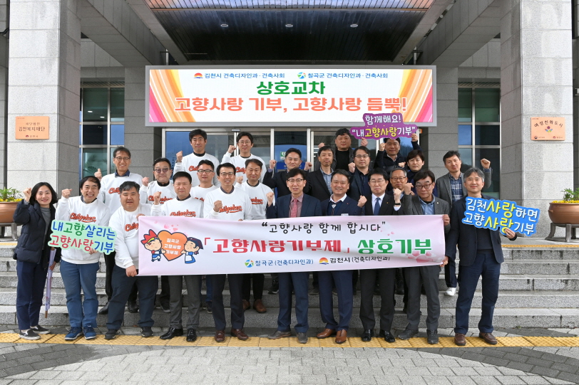 | 김천시 건축디자인과·지역건축사회는 3월 26일 고향사랑기부제를 활성화하고 지역사회 내 동참 분위기를 고조하기 위해 칠곡군 건축디자인과·건축사회와 상호 교차 기부에 나섰다.