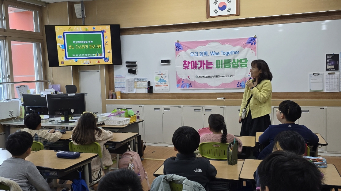 | 경상북도김천교육지원청(교육장 공현주) Wee센터는 소규모 학교와 전문상담 인력이 배치되지 않은 학교를 대상으로 ‘찾아가는 이동상담 프로그램’을 운영한다. 이번 프로그램은 3월 25일, 아천초등학교를 시작으로 4월 26일(금)까지 총 7개교 16학급에 소속된 학생을 대상으로 운영하며, ‘학교폭력 예방 분노 다스리기’, ‘사이버 폭력 및 스마트미디어 중독 예방프로그램’ 등을 통해 자기 이해와 친구에 대한 공감 역량을 키우는 활동으로 운영한다. 특히 학생들의 학교 적응력 및 프로그램의 효과의 극대화를 위해 김천Wee센터가 자체 제작한 시청각 자료를 활용하며, 학생들이 소규모 모둠 활동을 통해 자신의 감정 상태를 살펴보는 활동에 더해, 대인관계 기술을 향상 시키는데 주안점을 두었다.