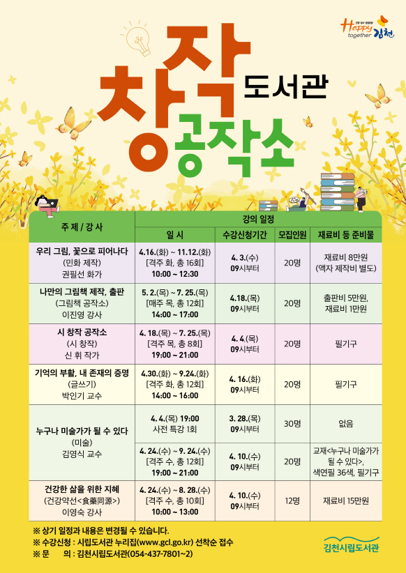 특히 <누구나 미술가가 될 수 있다>는 운영에 앞서 4월 3일부터 강사인 김영식 화가의 작품을 시립도서관 1층 전시실에서 전시할 예정이며, 사전 특강<나는 지금 어디에>은 4월 4일 목요일 19시 시립도서관 문화강좌실에서 진행된다. 자세한 참가 신청은 시립도서관 누리집(https://www.gcl.go.kr/) 공지사항을 참고하면 된다. 이순영 시립도서관장은 “행복문화의 장 도서관에서 자신만의 다양한 창작활동을 통해 성장하는 나를 발견하고, 일상을 더욱 아름답게 가꾸어가는 소중한 시간이 되길 바란다”라고 밝혔다. |
