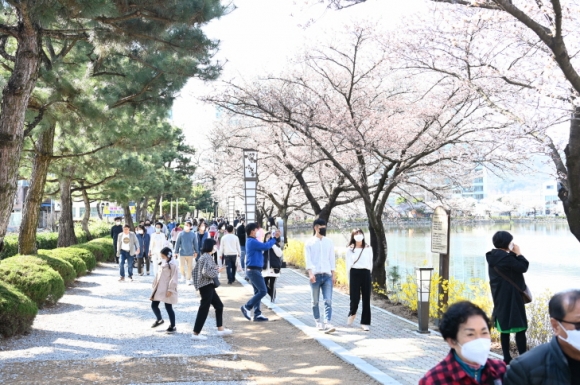 | 전국적인 벚꽃 명소로 입소문이 난 김천교동 ‘연화지’에 봄꽃을 즐기려는 관광객이 몰려들고 있다.