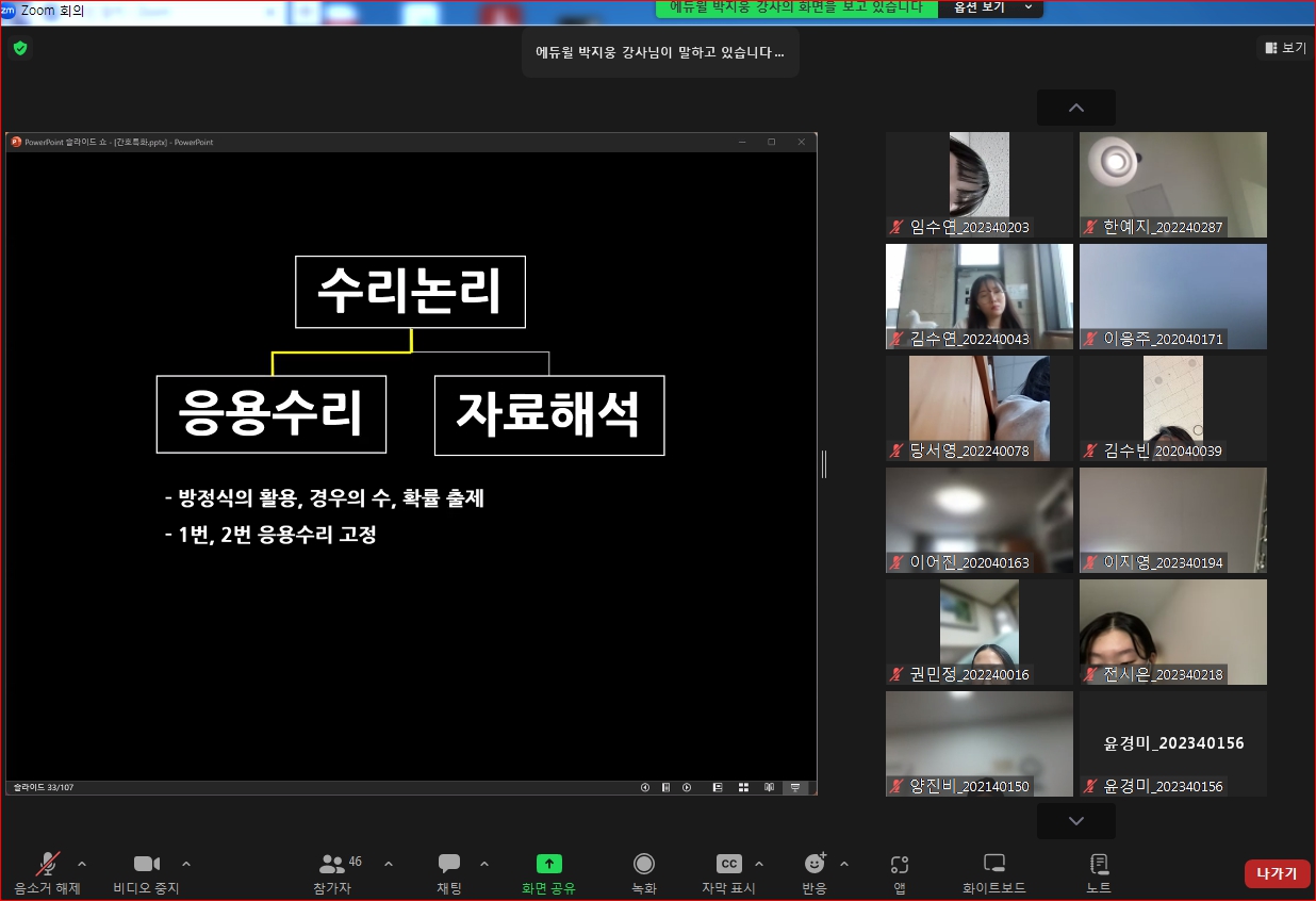 이번「GSAT 전략비법 특강」프로그램에는 에듀월의 박지웅 강사로 참여를 하였고, 재학생의 실무역량 강화 및 현장실무교육 강화를 목적으로 특히 수리영역을 중점으로 강의하였으며, 인정성 검사 역량 강화를 통해 취업 준비 역량 향상을 위해 ZOOM 온라인수업으로 진행되었다.