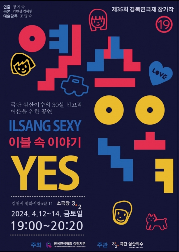 | 연극 ‘YES’는 순수창작극으로, 김천의 유일한 극단 삼산이수(대표 강정식)가 창단 30주년을 맞아 제작한 서른살 신고작이다. 경북연극제 출품작인 이번 작품은 연극제 기간 중인 4월 12일부터 14일까지 매일 오후 7시 3회에 걸쳐 소극장3.2(평화시장 5길 11 2층) 무대에 오른다.