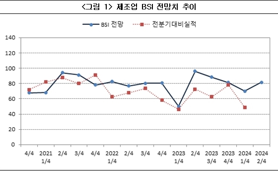 2024년 2/4분기 BSI지수가 상승했지만 기업들이 예상하는 경기전망은 지난 분기보다 ‘호전’될 것이라고 답한 기업보다 ‘악화’될 것이라고 답한 기업이 더 많았는데, 그 원인을 살펴보면 ‘원자재 및 유가 불안정’, ‘내수소비위축’, ‘자금조달여건 악화’ 등을 주된 이유로 꼽았다. 경기전망지수는 100 미만이면 다음 분기 경기가 이번 분기보다 나빠질 것으로 보는 기업이 더 많은 것이고, 100을 넘어서면 그 반대다.