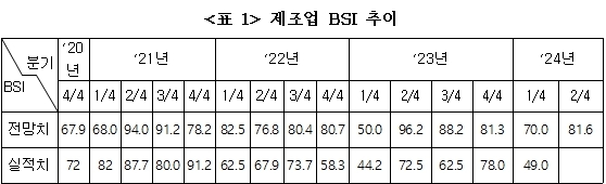 | 김천상공회의소(회장 안용우)가 최근 김천지역 관내 49개 제조업체를 대상으로 실시한 2024년 2/4분기(4월~6월) 기업경기전망지수를 조사한 결과에 의하면 지난 분기 70.0에서 11.6포인트 상승한 81.6를 나타냈다.