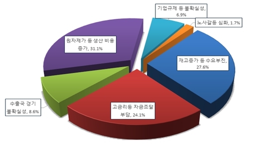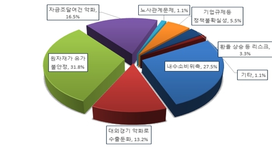 조사대상 업체의 올해 상반기 사업 실적에 가장 영향을 미칠 것으로 예상되는 대내외 리스크 요인은 무엇인가라는 질문에 ‘원자재가·유가 불안정’(31.8%), ‘내수소비 위축’(27.5%), ‘자금조달여건 악화’(16.5%),‘대외경기 악화로 수출둔화’(13.2%), ‘기업규제등 정책불확실성’(5.5%), ‘환율상승 등 리스크’(3.3%), ‘노사관계문제 및 기타’ 각(1.1%) 순으로 나타났다.