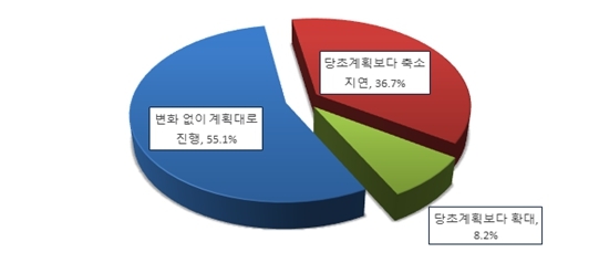 현재 시점에서 귀사의 투자는 연초에 계획한 상반기 투자계획과 비교해 어떻게 진행될 예정인가라는 질문에 ‘변화 없이 계획대로 진행’(55.1%), ‘당초계획보다 축소’(36.7%), ‘당초계획보다 확대’(8.2%)순으로 대답했으며 위 질문에 이어서 귀사의 투자가 축소되거나 보수적 입장을 지속하는 이유가 무엇이냐는 물음에 ‘원자재가 등 생산비용 증가’(31.1%), ‘재고증가 등 수요부진’(27.6%), ‘고금리등 자금조달’(24.1%), ‘수출국 경기 불확실성’(8.6%), ‘기업규제 등 불확실성’(6.9%), ‘노사갈등 심화’(1.7%)로 답하였다.