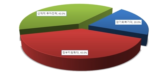 | 이어서 당초 계획한 수준보다 투자를 확대하는 이유는 무엇인가라는 질문에 ‘정부지원확대’(40%), ‘선제적투자전략’(40%), ‘경기회복기대’(20%)로 답하였다.