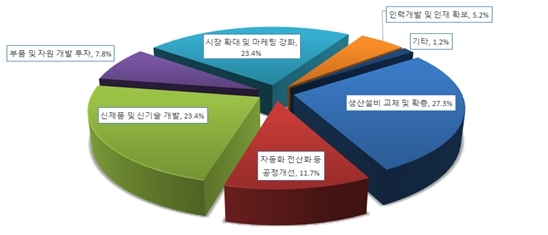 올해 귀사에서 가장 우선시하는 투자영역은 어느분야인가 라는 물음에 ‘생산설비 교체 및 확층’(27.3%), ‘신제품 및 신기술개발 및 시장 확대 및 마케팅 강화’ 각(23.4%), ‘자동화·전산화 등 공정개선’(11.7%), ‘부품 및 자원 개발 투자’(7.8%), ‘인력개발 및 인력확보’(5.2%), ‘기타’(1.2%)순으로 대답하였다.