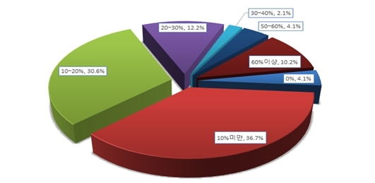 신기술개발, 공정 개선 등 혁신투자는 귀사의 전체 투자에서 어느정도 비중을 차지하는지 물음에 ‘10%미만’(36.7%), ‘10∼ 20%’(30.6%), ‘20∼30%’(12.2%), ‘60%이상’(10.2%), ‘ 0% 및 50∼60%’ 각(4.1%), ‘30∼40%’(2.1%)로 나타났다.