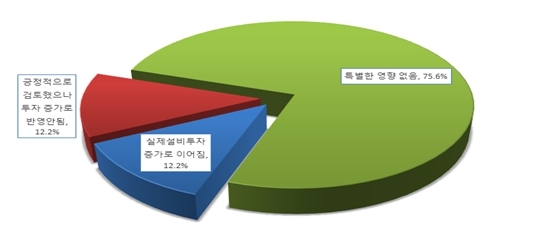 지난해 실행된 임시투자세액공제제도가 올 연말까지 연장됨에 따라 올해 귀사 설비투자 계획에 어떤 영향을 미쳤는지에 대한 물음에 ‘특별한 영향 없음’(75.6%), ‘긍정적으로 검토했으나 투자 증가로 반영안됨 및 실제설비투자 증가로 이어짐’ 각(12.2%)로 나타났다.