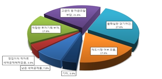 위 질문에 이어서 임시투자세액공제가 귀사 설비투자계획상 규모 증가에 영향을 주지않는 이유는 무엇인가라는 물음에 ‘불확실한 경기여건’(27.6%), ‘고금리 등 자금조달’(21.6%), ‘제도시행 여부모름 및 적합한 투자기획 부재’ 각(17.6%), ‘낮은 세액공제율’(7.8%), ‘영업이익 적자로 세액공제혜택없음 및 기타’ 각(3.9%)로 나타났다.