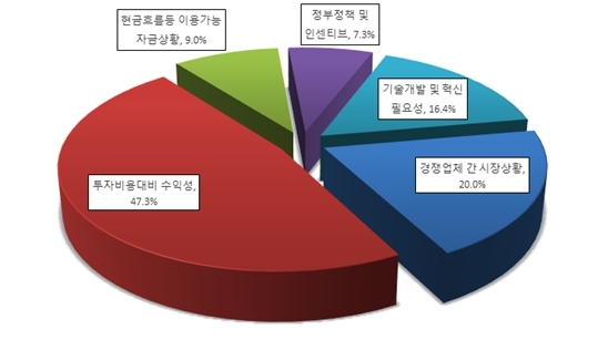 귀사의 투자계획 수립 및 실행과정에서 가장 중요하게 고려하는 요소는 무엇이가 라는 물음에 ‘투자비용대비 수익성’(47.3%), ‘경쟁업체 간 시장상황’(20.0%), ‘기술개발 및 혁신 필요성’(16.4%), ‘현금흐름 등 이용 가능 자금상황’(9.0%), ‘정부정책 및 인센티브’(7.3%)로 답하였다.