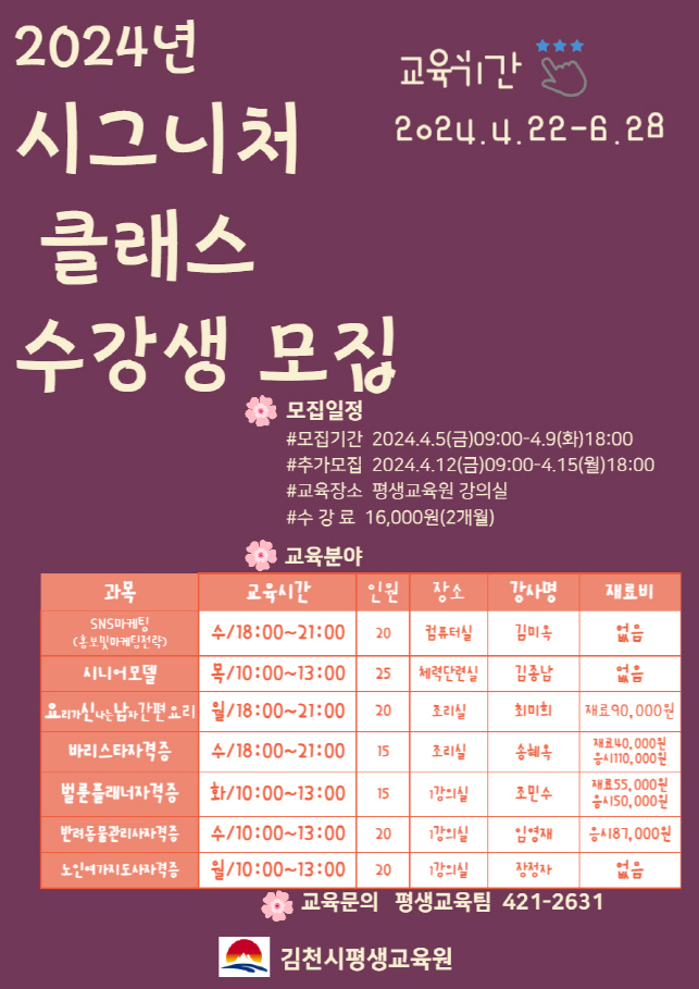 | 김천시평생교육원에서는 「2024년 시그니처 클래스」수강생을 오는 4월 5일부터 4월 15일까지 선착순 모집한다고 밝혔다.